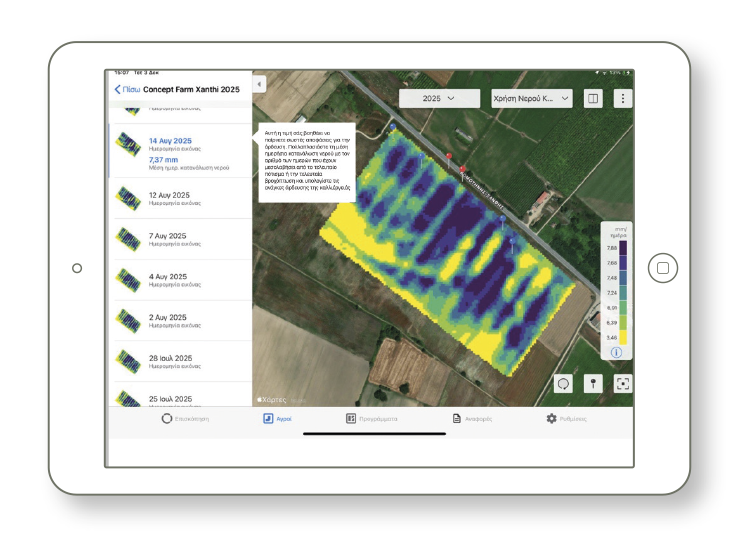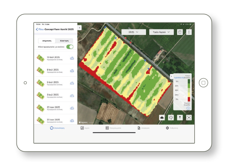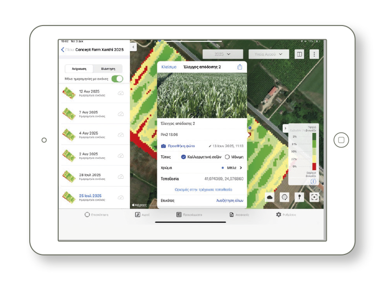 - Παρακολουθεί την ανάπτυξη της καλλιέργειας μέσω χαρτών που προβάλλουν την υγεία και την ευρωστία αυτής.